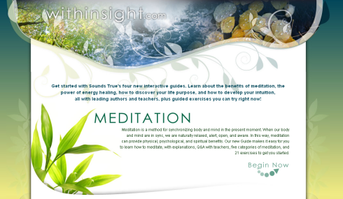 Plus, opened my eyes to this great site, Sounds True. It appears there are some interesting products to purchase off the site but what I found instantly valuable was another section or affiliate site, Within Sight, which provides streaming of a wide range of meditation guidance audio tracks.
